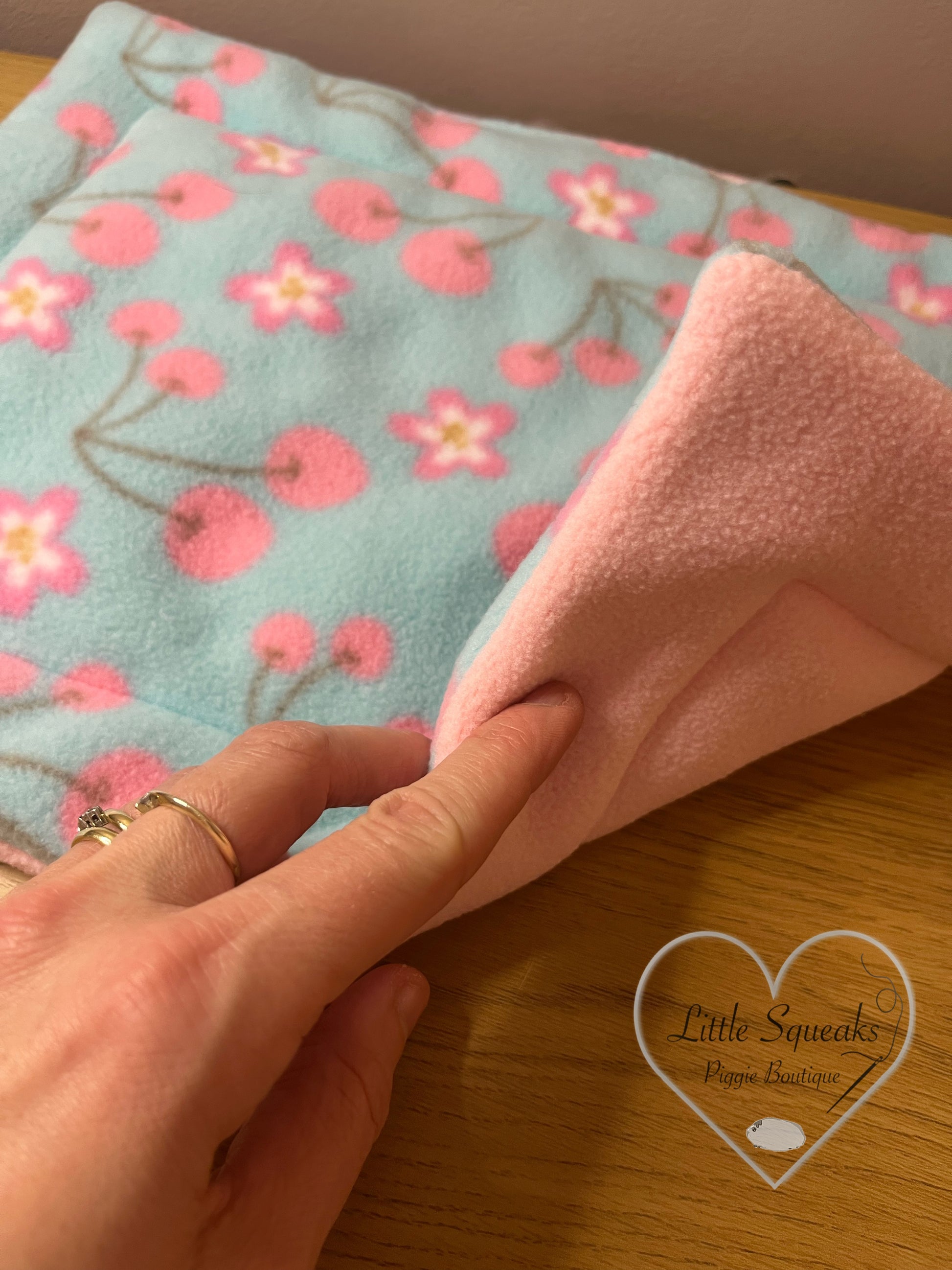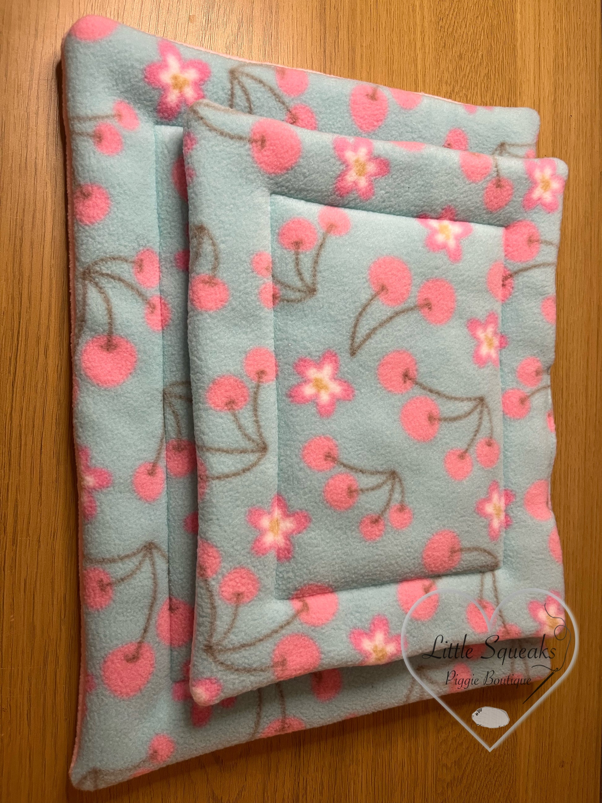 Pee pad for guinea pigs in a super soft cherry blossom patterned fleece, with a plain milkshake pink reverse.